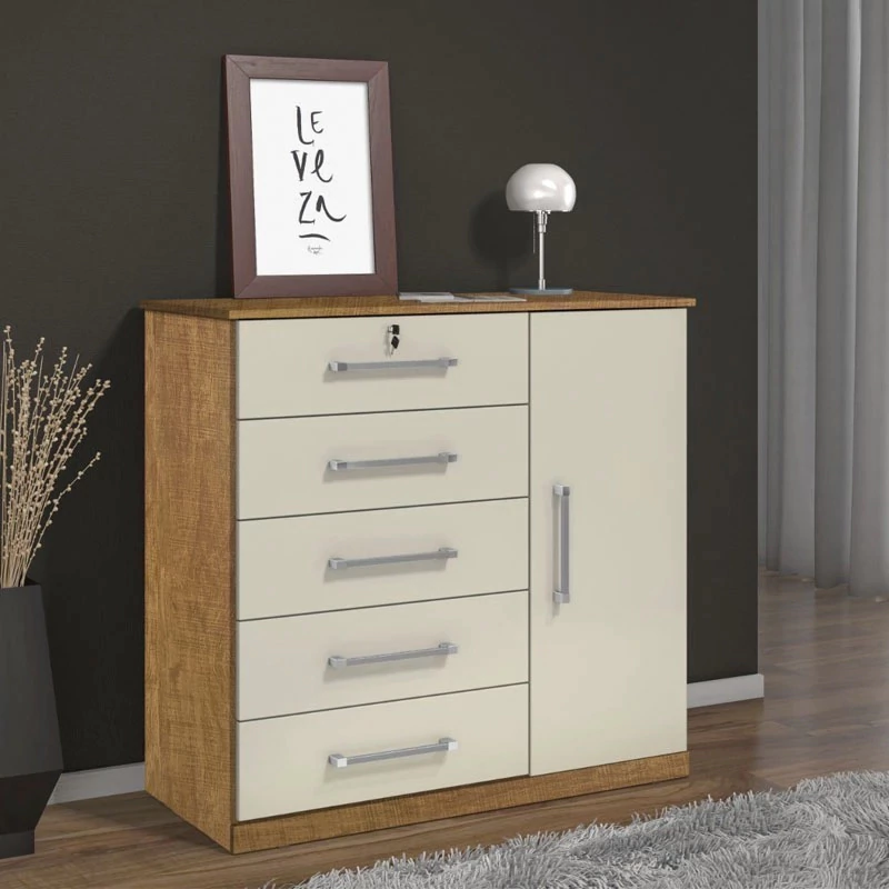 Com suas 5 gavetas espaçosas, esta cômoda oferece amplo espaço para guardar roupas, acessórios e objetos pessoais de forma organizada. As gavetas deslizam suavemente, proporcionando praticidade no dia a dia.