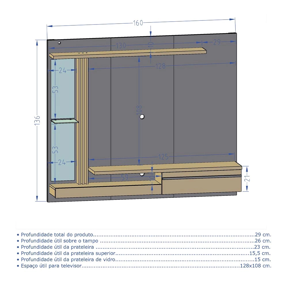 Medidas do espaço para TV: 128 x 108 cm (AxL)